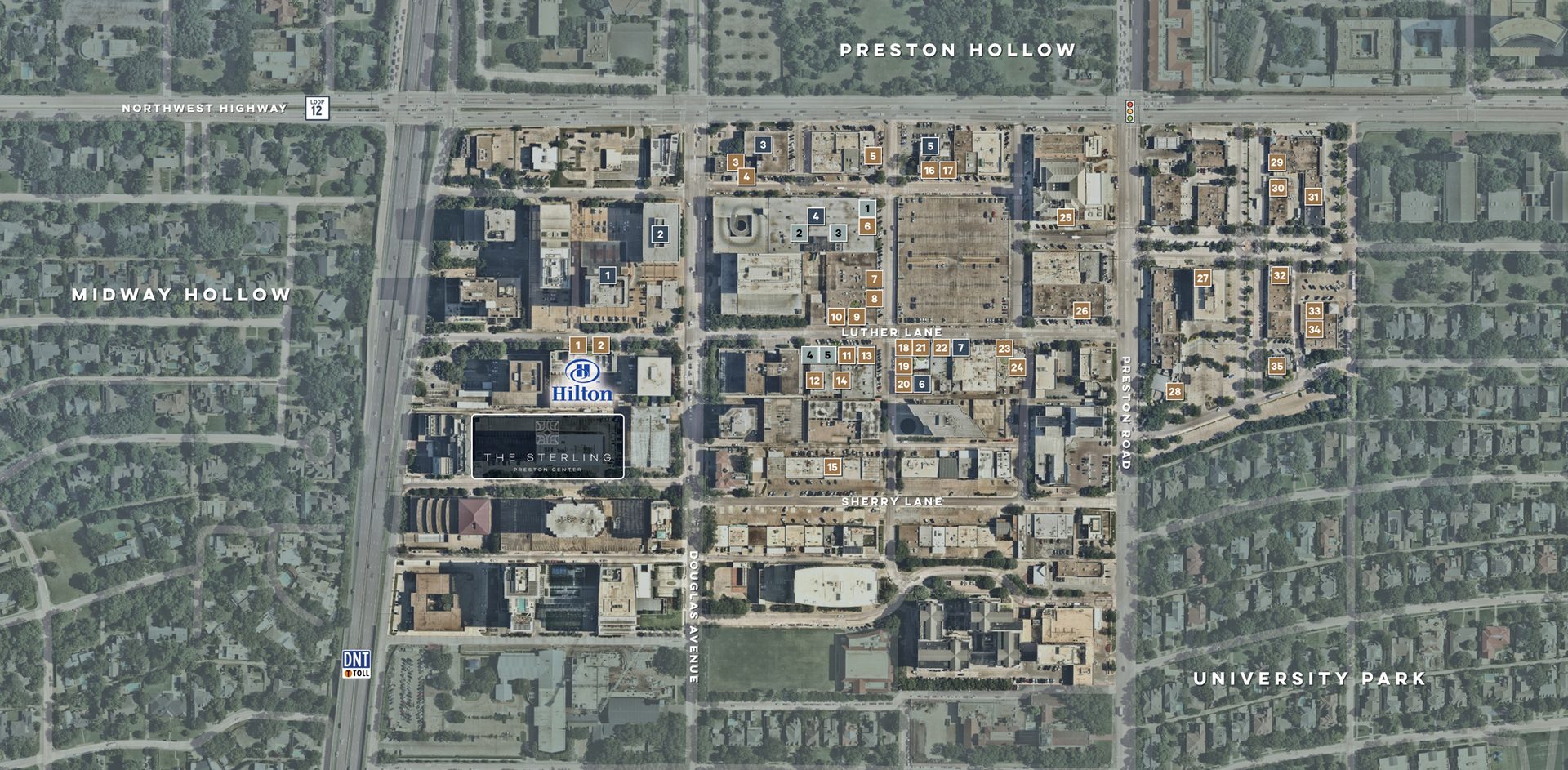 The prestigious Preston Center submarket, located between Preston Hollow and University Park, is known for its walkable, dense collection of amenities and dining. For added convenience, tenants at The Sterling have access to daily private shuttle service throughout Preston Center.